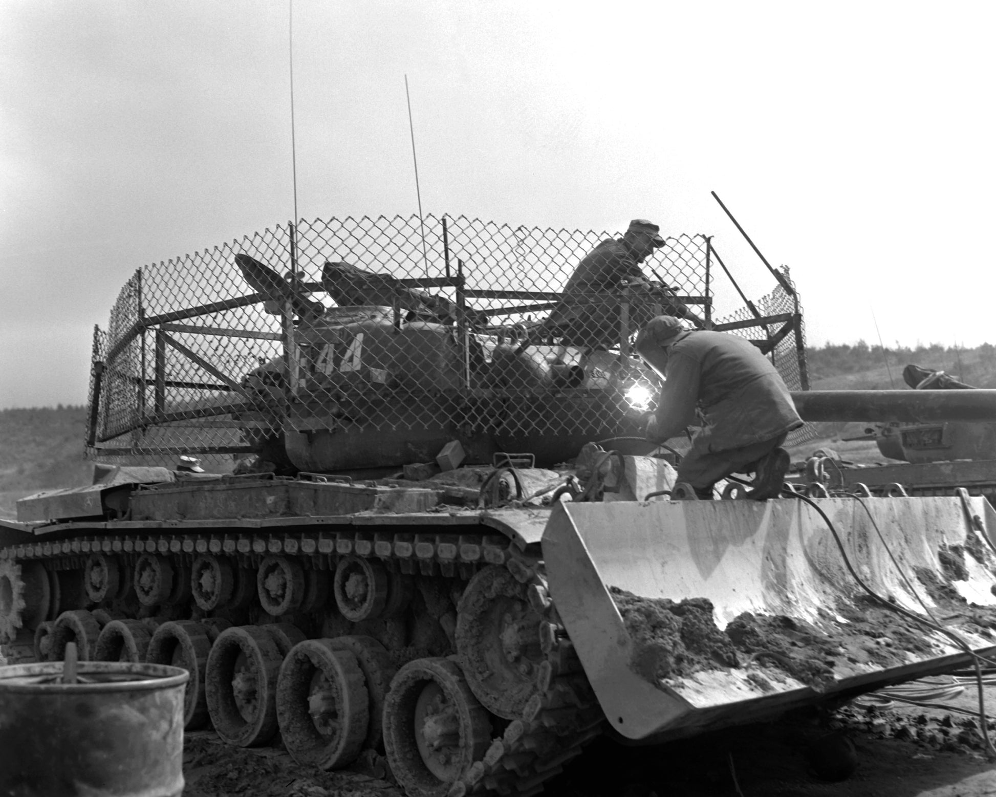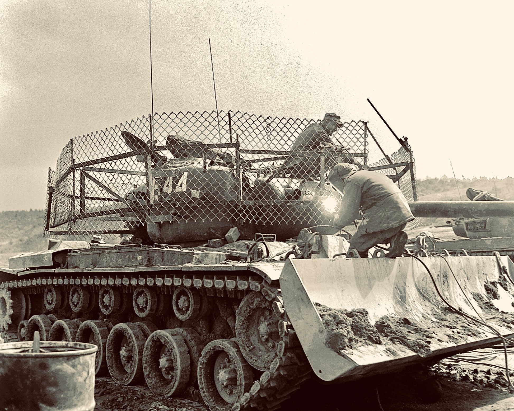 During the Vietnam War, mechanised units commonly used chain-link fencing as improvised standoff armour — often referred to as “car ports.” Mounted 1–2 feet in front of vehicle hulls, the mesh was intended to disrupt or prematurely detonate the piezoelectric fuzes of incoming PG-7 series RPG rounds before impact.
